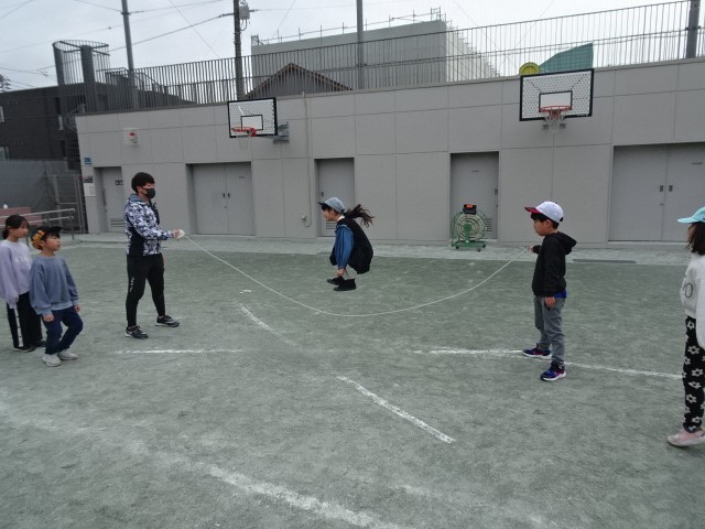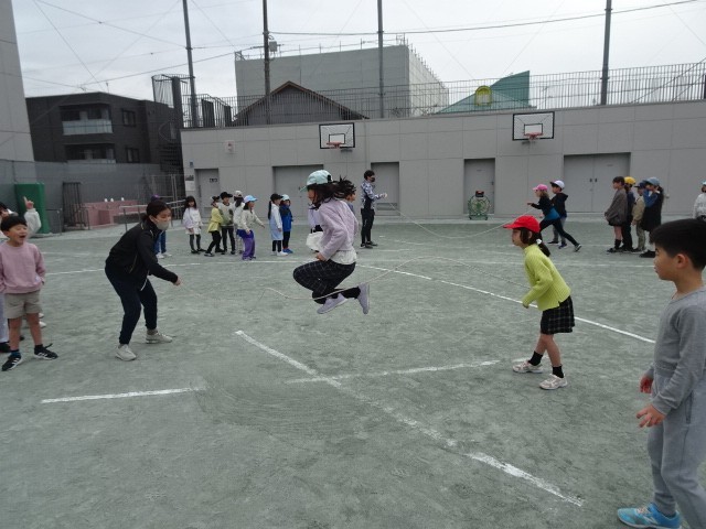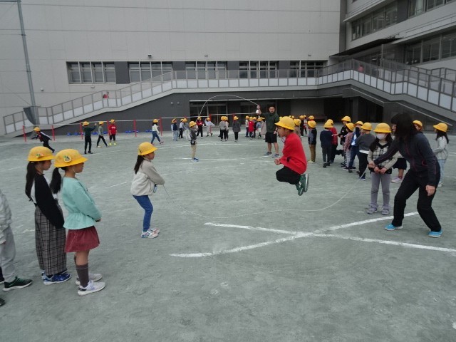 朝のランランタイムで1・2年生が長縄の記録測定を行いました。1年間練習してきて1年生も2年生も上手になってきました。