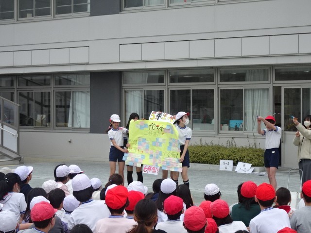 結果発表をしています。どの組が勝ったかは子どもから聞いてください。6年生から5年生へ言葉での激励だけでなく、メッセージも送られました。最後は昇降口までアーチで6年生を見送っています。良い思い出になったと思います。4月から最上級生になる5年生6校時は、卒業式の会場準備をしっかりと行っていました。