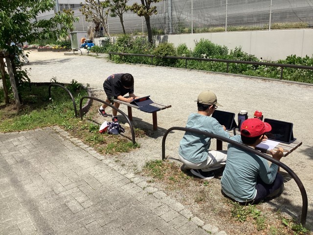 せせらぎ緑道にて、図工の学習です。気持ちのいい天気のもとで、思い思いの木をじっくりていねいに見つめてきました。