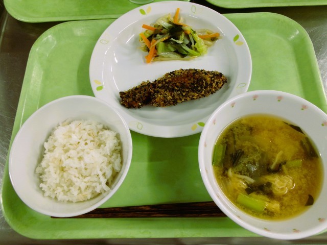 麦ごはん 牛乳 魚のごまフライ 野菜の和風ドレッシング みそ汁