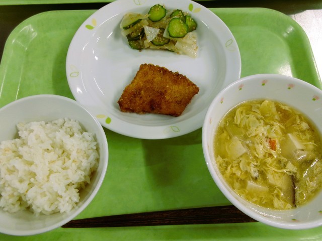 今日の献立、いかのかりんとあげは、甘辛いつけ汁に漬け込んだいかを香ばしく揚げたものです。しっかりと、よく噛んで食べましょう。また、サンラータンは、中国料理の一つで、中国では、スーラータンと呼ばれています。このスープは、酸味と辛みが特徴です。肉や野菜などを煮込み、しょうゆなどで味を調えた後に、でんぷんでとろみをつけて、溶き卵を流し込んでいます。おいしくいただきましょう。