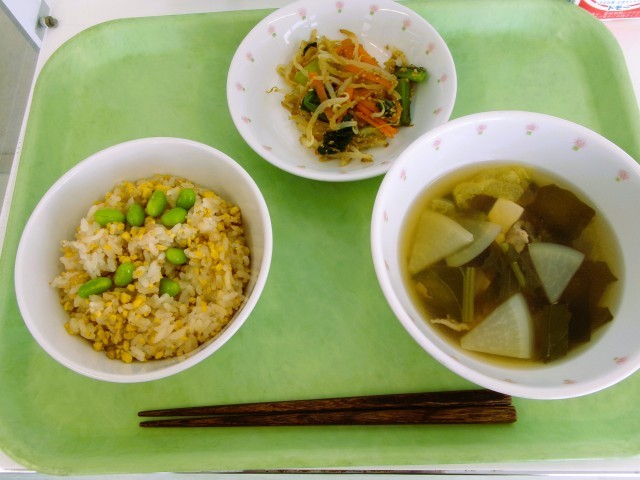 豆腐は、何から作られているか知っていますか。豆腐は、大豆から作られています。大豆は、種の部分ですが、発芽したものは、豆もやしになりますし、大きく成長して花が咲き、実のると、枝豆として食べることもできます。大豆は、豆腐のほかにも色々な食品に加工されています。どんな食品が大豆から作られるのか、調べてみましょう。配膳室前にポスターをはりました。見てみましょう。