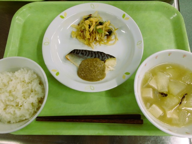 今日のごはんは、有機栽培のお米(青森県つがる市 あきもと農園のつがるロマン)を使っています。職員室前の給食掲示板に、お米ができるまでの、イネの生長を描いたポスターを貼っています。見てくださいね。