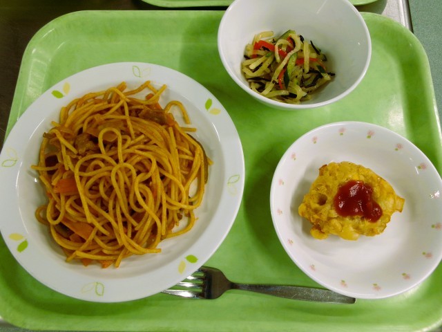 スパゲッティナポリタン 牛乳 ひじきのサラダ おまめとコーンのフリッター