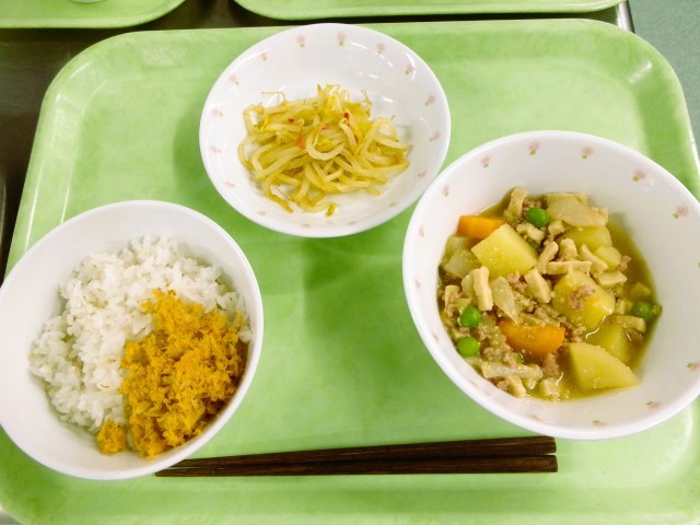 麦ごはん 牛乳 ツナと人参のふりかけ じゃがいものそぼろ煮 もやしのカレーじょうゆ