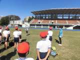 お弁当を食べた後は、きれいな芝生の上で開会式をしました。広い陸上競技場は、代沢小...
