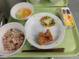 〇本日の献立〇 赤飯 牛乳 鶏肉の立田あげ 野菜のおかかかけ フルーツ白玉 〇...