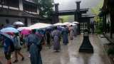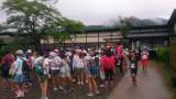 雨の江戸村見学。傘をさしての班行動の始まりです。