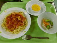 〇本日の献立〇スパゲッティトマトソース 牛乳 ピクルス キャロットケーキ 今日の...