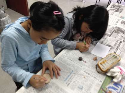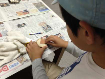 輪切りした木を紙やすりでみがいて、下絵を描いています。