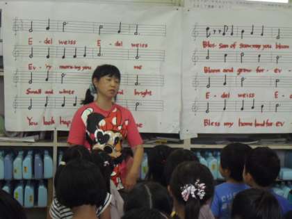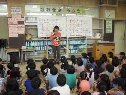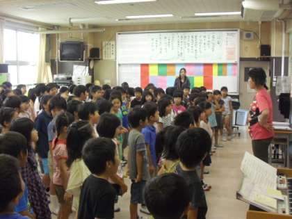 7月5日(金)の1時間目に、2年生が合同で、音楽の鈴木先生に音楽の授業をしてもらいました。「にじ」の振り付けを教わったり、英語の歌詞の「エーデルワイス」の歌い方を教わったりしました。高学年になったような誇らしい気持ちで、一生懸命頑張っていました。