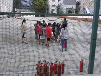 子供たちも消化器の体験をしたり、備品倉庫を見学したりしました。