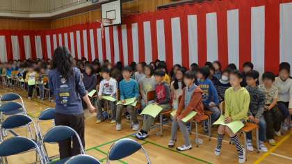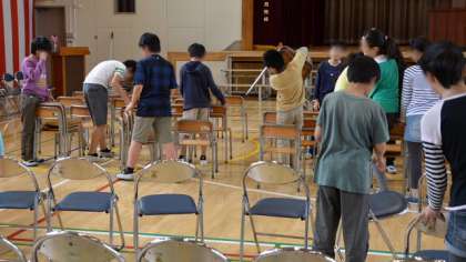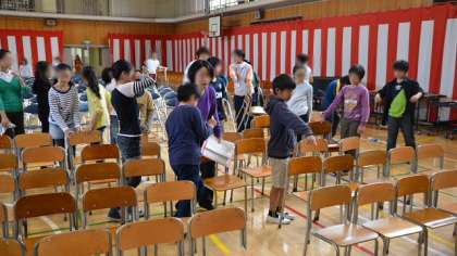 作業の最後は体育館で入学式の準備。教室から1年生用の倚子を運んできて並べたり、折りたたみ倚子を水拭きしたり、ていねいに並び替えたりと大活躍。さすが最高学年。立派です。