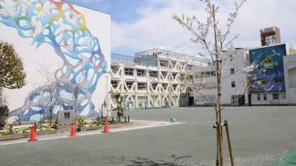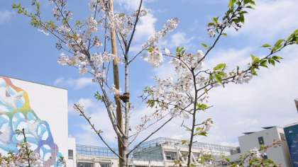 4日、昼前から天気が回復してきて青空も見えました。昨年度整備作業が終わったばかりの校庭。西門前に植えられた桜の若木です。しっかり咲きました。これから子どもたちとともに成長して、将来は二子玉川小のシンボルの桜になることでしょう。