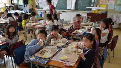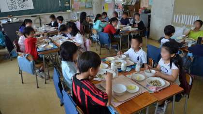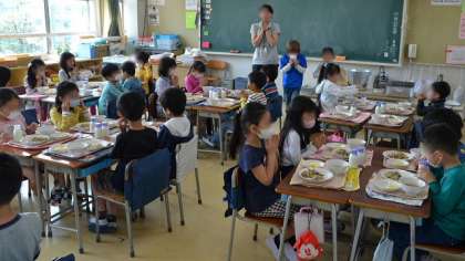 10日(木)、今日から給食がスタートしました。メニューは、豆入りひじきごはん、豚汁、リンゴ、牛乳です。写真は2年生の給食のようすです。おいしそうに食べていました。