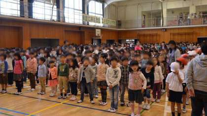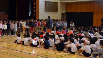 ステージ前に姿勢よく並んだ1年生。6年生代表児童が歓迎の言葉を述べ、お礼の気持ちと「よろしく」という気持ちをこめて、1年生が元気に歌を歌いました。がんばった1年生に、2〜6年生が大きな拍手をおくります。1年生は集会の位置に移動して、仲間入り終了です。