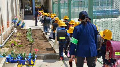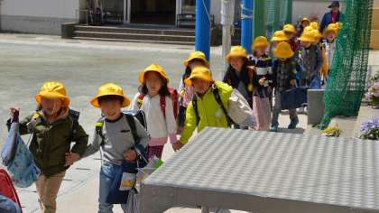 11日、1年生は3時間目までの授業。昼前に校庭に集合して方面別に分かれて、担任や学校主事に引率されて下校しました。来週の月曜日は3校時まで、火曜日は4校時までとなり、いよいよ給食も始まります。もうすっかり学校に慣れてきた1年生です。