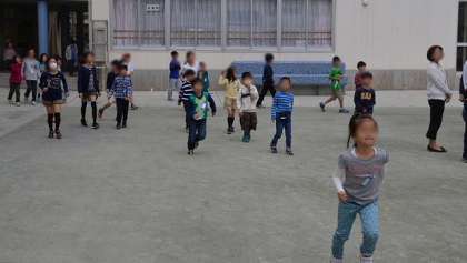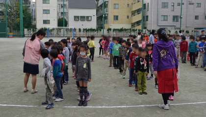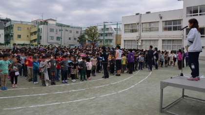 14日(月)、今年度初めての朝会を校庭で行いました。開始時間を前にいち早く集合した1年生。他の学年も次々と集まってきて、開始の時刻にはほぼ全員がそろって整列することができました。