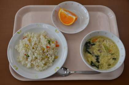 三色ピラフ 牛乳 卵スープ デコポン