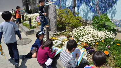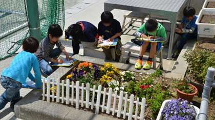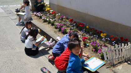 15日、朝から暖かい日差しが降り注ぐ校庭で、2年1組の子どもたちが生活科の学習で、花のスケッチをしていました。今、学校の花壇は花が一杯。そして1年生の時に球根を植えたチューリップも咲いています。子どもたちは、気に入った花を丹念にスケッチしていました。花びらの重なり具合を一生懸命描いている子、花びらや葉の細かい形に着目して描いている子など様々ですが、みんな根気よく取り組んでいたのが印象的です。