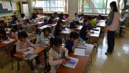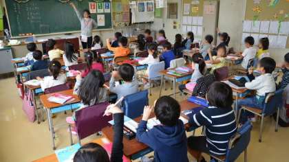1年生の授業のようす。3組と4組は国語の授業で、ひらがな「つ」の書き方を学習していました。鉛筆の持ち方や練習帳の使い方、質問されたときの発言のルールなども習っていました。学校生活にも慣れてきて、しっかり勉強に励んでいる1年生です。