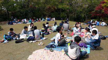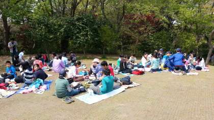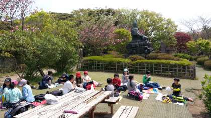 源氏山公園の頼朝像の周辺で昼食。家から持ってきたお弁当をおいしくいただきました。アブがたくさんいたのには、ちょっと困りましたが! 11時半からグループごとに大仏までハイキングをします。