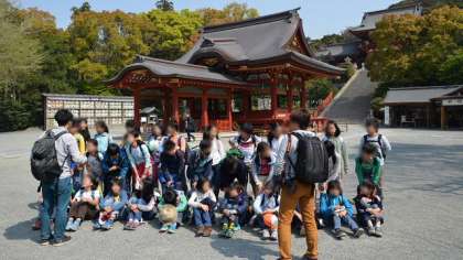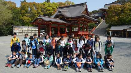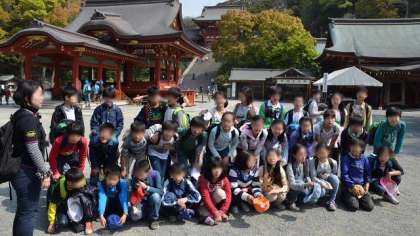 鶴岡八幡宮境内でクラス写真を撮影。笑顔があふれます。天気がよくて最高です。