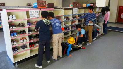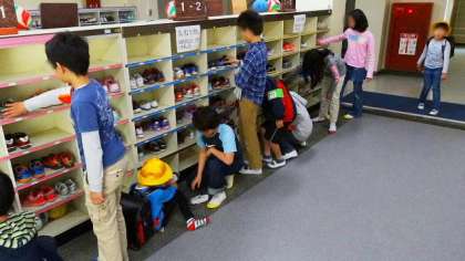 19日朝、1年生の昇降口で6年生の1年生お世話当番が活動していました。登校してきた1年生を元気なあいさつでむかえていました。「靴のかかとがそろっていた方が気持ちいいね」と声をかけると、「それはそうですね」と言って、さっそくみんなで靴をそろえ始めました。よいことは率先して行動する6年生に感心しました。