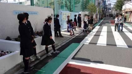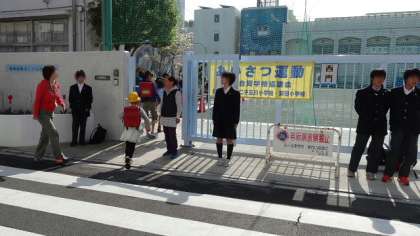 今週は「多摩川の学び舎」3校合同あいさつ運動期間です。22日朝のようすです。瀬田中学校の本校卒業の生徒が、通学途中に東門と西門であいさつ運動に加わって、さわやかなあいさつを後輩の小学生にしています。