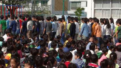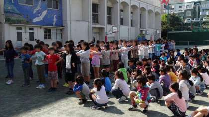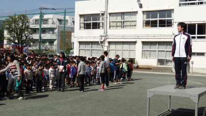 23日朝、校庭で全校体育朝会を行いました。運動会を控えて、「前ならい」や「休め」「回れ右」など、整列時の基本的な動きを練習しました。最初に担当教員が見本を、そして5・6年生全員が見事な見本となる動きをして見せました。