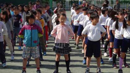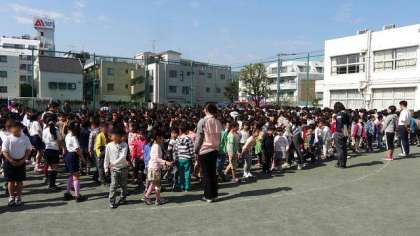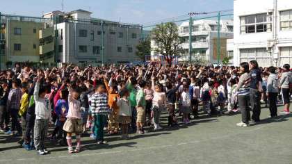 見本を見た1〜4年生。5・6年に負けない気持ちでがんばりました。「しっかりできたと思う人?」と聞くと、みんな「はーい」。よくできました。