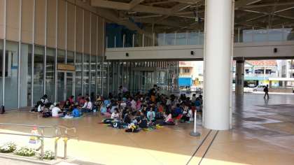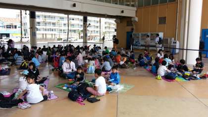 ちょっと早めの昼食です。家から持ってきたお弁当を、美味しそうに食べる子供たち。幸せそうです。トンビ対策で、残念ながら海岸では食べられませんでした。
