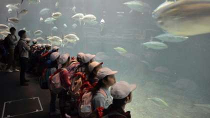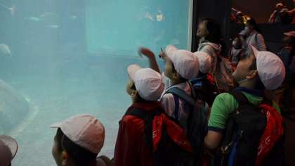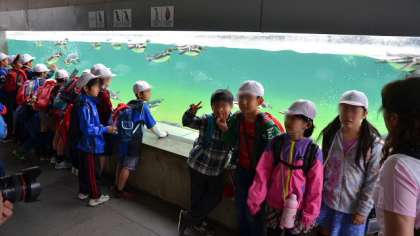 葛西臨海水族園では、クラスごとに順路に従ってみんなで見学しました。マグロの回遊水槽前では、大きなマグロにびっくり。