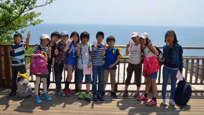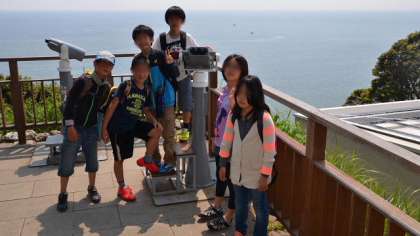 江ノ島の頂上付近の展望台からは、広々とした海が目の前に広がって、坂道を上ってきた子どもたちが一休み。「海はきもちいいねえ」
