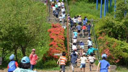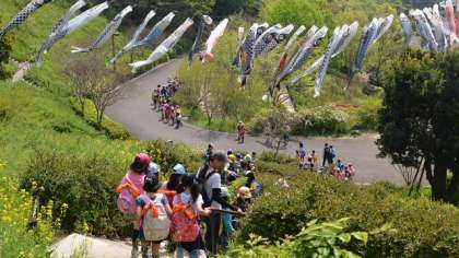 遠足ハイライト。最後は4月25日の3年生の遠足のようすです。3年生は横浜市立金沢動物園に行きました。動物園見学の前に近くの公園で遊びました。斜面に作られた公園には鯉のぼりが風にはためいていました。この日も天気がよく遠足日和。