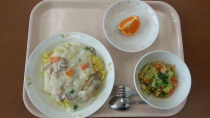 バターライスのクリームソースかけ 牛乳 イタリアンサラダ くだもの