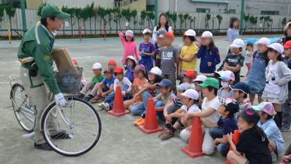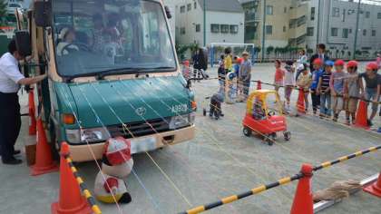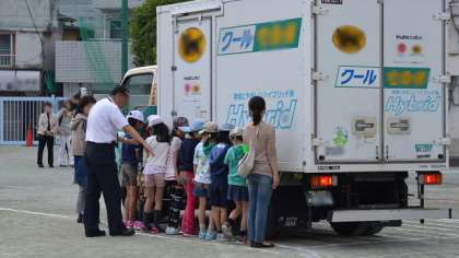 後半は、クラスごとに、トラックの運転手から見えないところがあることを実際に運転席から体験したり、大型車の内輪差をすれすれに近づくトラックで実感したり、自転車の扱い方について説明を受けた、これまた非常に実践的な交通安全教室となりました。約45分間、たくさんの実感を伴った学習をして、運送会社の皆さんにお礼をして終了しました。お世話していただいたPTA校外委員の皆さんと、指導してくださった運送会社の皆様に感謝です。