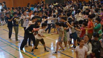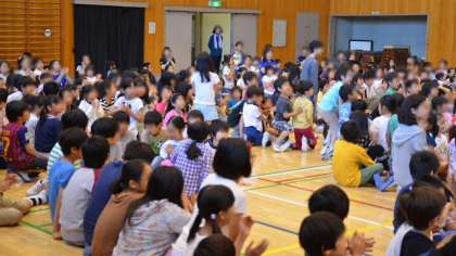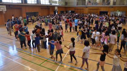 ・・・16人、32人・・・どんどん列が長くなりにつれて、先頭の子のじゃんけんにも力が入ります。最後は体育館半周分の長蛇の列に。最後に残った先頭の子にみんなで拍手を送りました。集会委員会の子どもたちが司会進行をしてくれました。