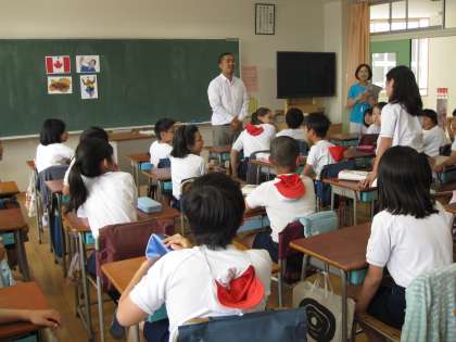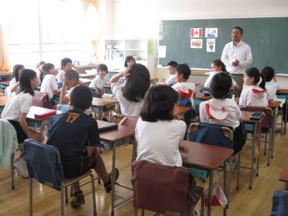 外国語活動においては,音声を中心に外国語に慣れ親しませる活動を通じて,言語や文化について体験的に理解を深めるとともに,積極的にコミュニケーションを図ろうとする態度を育成し,コミュニケーション能力の素地を養うことを目標として様々な活動を行います。今日は,カナダ出身の先生と交流しました。クラス全員の子どもたちが友達の前で少し緊張しながら英語であいさつをしました。