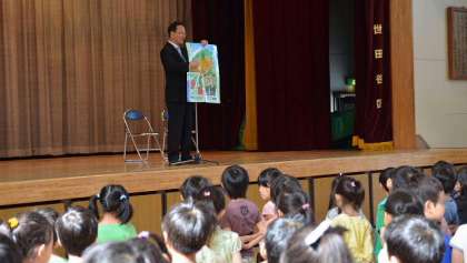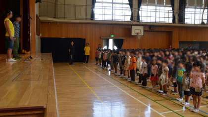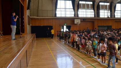 12日(月)、朝会はその後の離任式のために体育館で短時間で行いました。校長講話では、先週10日から始まった愛鳥週間(バードウィーク)の紹介をしました。本校は愛鳥モデル校です。子供たちが関心をもってすごすよう呼びかけました。続いて代表委員会児童から、今月末の運動会にむけてのスローガン発表があり、創意工夫あふれるスローガンに、子どもたちがどよめきました。とっても斬新ですてきなスローガンです。運動会でご披露させていただきますのでお楽しみに。