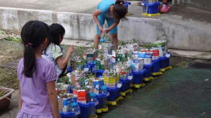 2年生が生活科の授業で栽培活動に取り組みます。14日、今日はは自分のプランターに学校主事にも手伝ってもらい土を入れ、ミニトマトの苗を植えました。