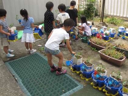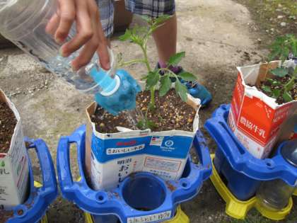 じょうぶに育つように工夫しました。牛乳パックで鉢のかさ上げをして培養土を入れると,鉢よりも深くなり,しっかりと根を張って元気に成長します。植えた後は,うれしそうにさっそく水やりをしていました。