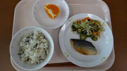 菜めし 牛乳 さばの塩焼き 糸寒天のサラダ カラマンダリン