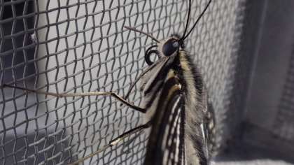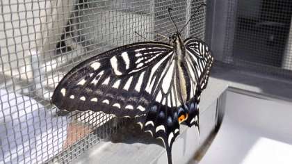 幼虫から育てていたアゲハチョウが羽化しました。羽化の様子を撮影したいと思っていましたが、残念ながら19日月曜日の朝には羽化していました。飼育用のカゴを開けても、なかなか飛んでいかなかったので、手でうながしたら、元気に飛んでいきました。校長室にはサナギがあと2頭いますので、タイミングがあえば撮影にチャレンジしてみたいと思っています。