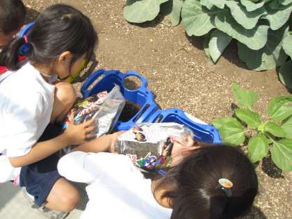 1 はんぶんまで土を入れる。 2 ひりょうを入れてまぜる。