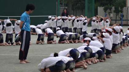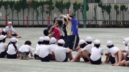 がんばる子供たちに負けじと、担任もがんばります。裸足でグランドに膝をつき、見本を見せます。子供たちもその熱意に応えようと努力している姿がすてきです。