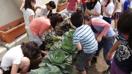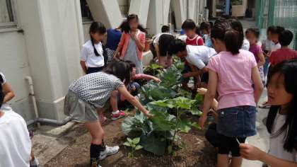 20日、3年生の理科のようすです。3年生はチョウの飼育とひまわりの栽培をしています。自然が相手ですからこれがなかなか思うようにはいきません。花壇に植えたキャベツについた卵や幼虫を見つけようと、目を皿のようにして観察しています。見つけた幼虫は、教室で飼育しているのですが、なかなかうまくいかないこともあります。そんな自然の難しさを知ることも理科の学習ですね。(写真は3年3組です)