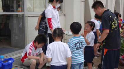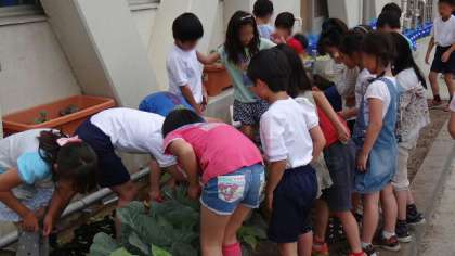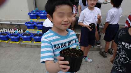 先日まいたヒマワリの種が発芽して大喜びの子供たち。目を輝かしています。(写真は3年2組です)