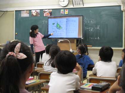 実物投影機を使用して,50インチテレビに観察カードを映します。よくできているところをみんなで確かめます。紹介された子は,とてもうれしそうです。