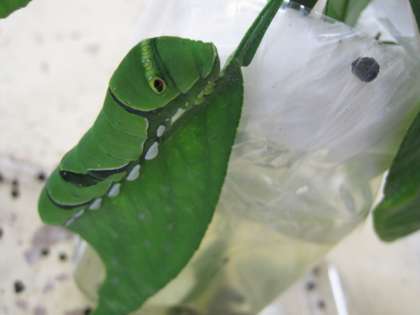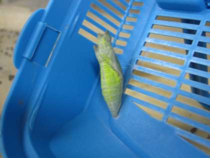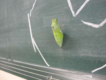 カブト虫の幼虫,アゲハの卵,アゲハの幼虫,アゲハのさなぎ,メダカ,タニシ,ひまわり…。 あっ!黒板にアゲハのさなぎが…,水槽のふたにも。